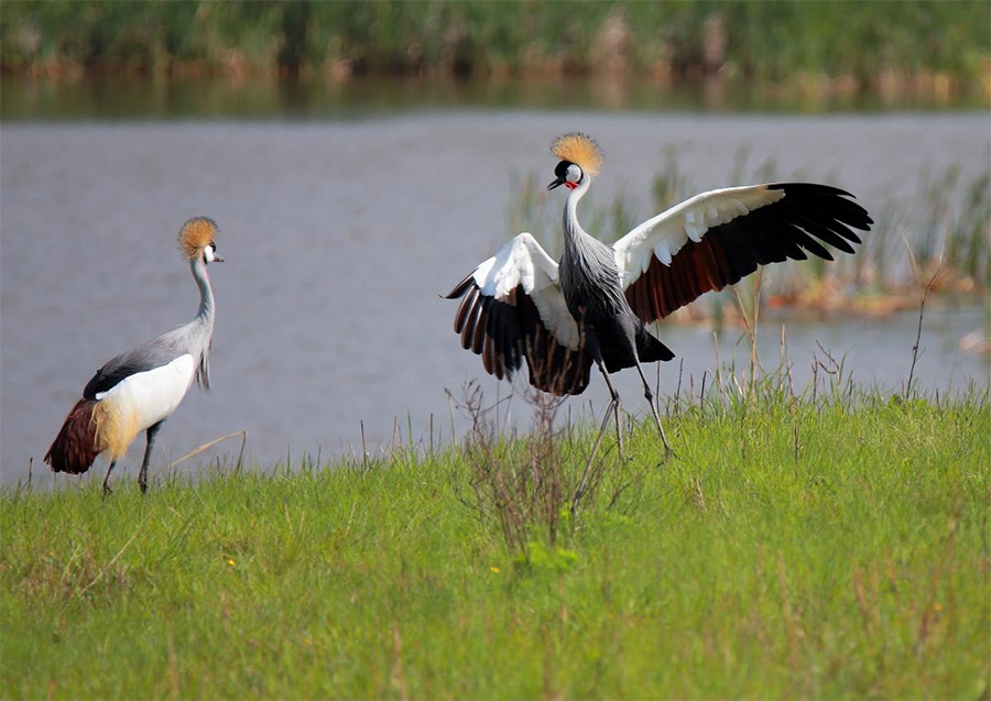 We arrived well ahead of the appointed time and found the Sanctuary locked and deserted, so set off for the wetlands, finding Grey Crowned Cranes happy to perform for us. Mostly because of the unrelenting wind we found few birds, but the cranes more than made up for it. They are truly majestic in flight as well as on land, and here the wind was our ally as the birds flogged and wheeled to reach their places, giving us unrivalled opportunities to record their splendour. Before long we retraced our steps, the buffeting wind now at our backs, to be met by the effervescent Nicki at the now open gate of the Sanctuary.